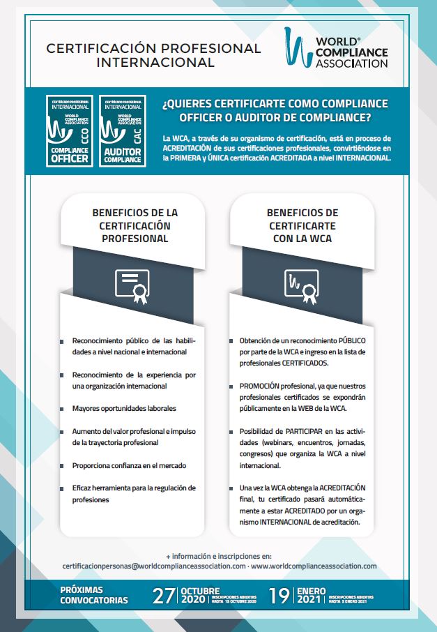 En el caso de la WCA, a través de su organismo de certificación profesional ha desarrollado dos categorías (Compliance Officer y Auditor de Compliance) que, además, actualmente están en proceso de Acreditación por IAS (International Acreditation Service) de forma que serán las PRIMERAS Y ÚNICAS CERTIFICACIONES INTERNACIONALES OFICIALES EN ESTAR ACREDITADAS.