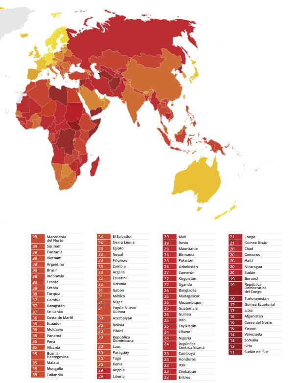 Más de dos tercios de los países (68 %) están por debajo de 50 en la escala y la media global sigue estancada en 43. Desde 2012, 25 países han mejorado sus puntuaciones significativamente, pero 23 han empeorado el mismo modo10.