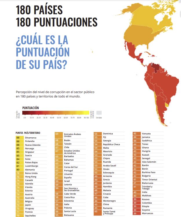 El índice califica 180 países y territorios de todo el mundo según la percepción que tienen especialistas y empresarios de la corrupción existente en el sector público de su país. Se basa en 13 fuentes de datos independientes y emplea una escala de cero a cien, donde el cero representa un alto nivel de corrupción y, el cien, corrupción prácticamente inexistente.