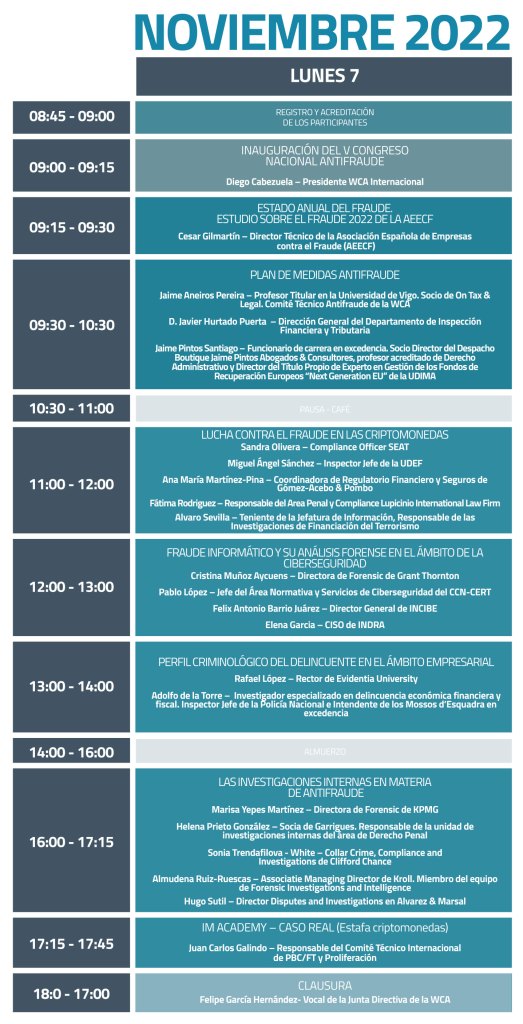 La World Compliance Association, a través del Comité Antifraude y el Comité Técnico de Compliance IT y Seguridad , juntamente con Evidentia University y la Asociación Española de Empresas Contra el Fraude (AEECF), organiza el próximo 7 de noviembre el V CONGRESO NACIONAL ANTIFRAUDE.