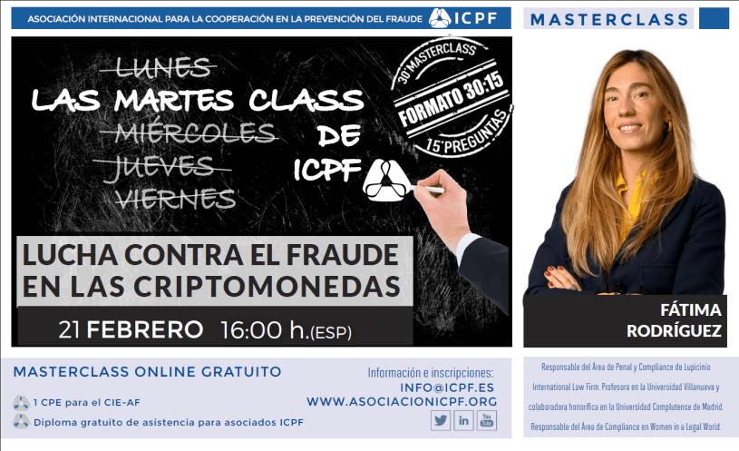 De la mano de Dª. Fátima Rodríguez Responsable del área de Penal y Compliance de Lupicinio Internacional Law Firm. Profesora en la Universidad Villanueva y colaboradora honorífica en la Universidad Complutense de Madrid. Responsable del área de Complace en Women in a Legal World, vamos a poder participar en esta masterclass en cómo combatir el fraude en esta nueva realidad financiera que ha surgido de la mano del mundo del blockchain y de las criptomonedas.