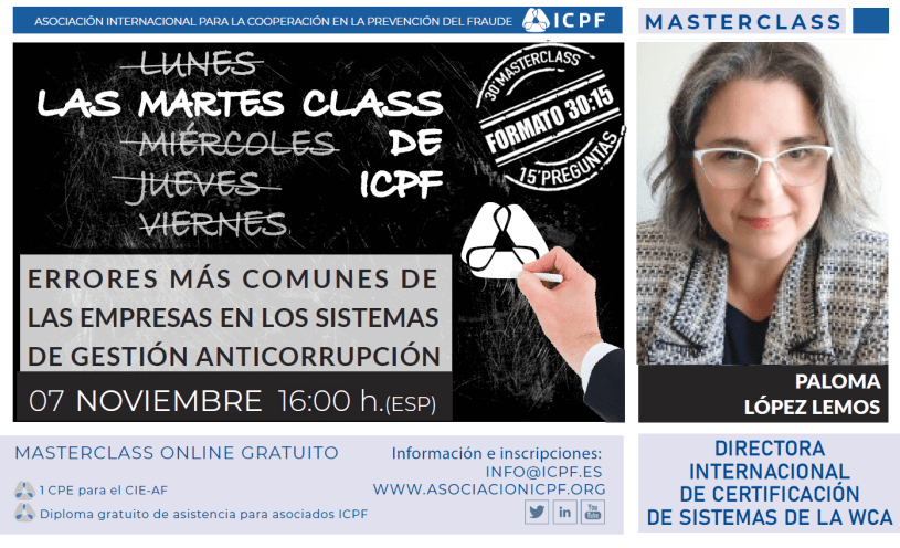 De la mano de Paloma López Lemos, Directora Internacional de Certificación de Sistemas de la WCA, entidad acreditada por IAS para certificación de la norma ISO37001 y ISO37301, y con una amplia experiencia internacional en liderar equipos de auditoria de sistemas de gestión antifraude, vamos a disfrutar de esta Martesclass.