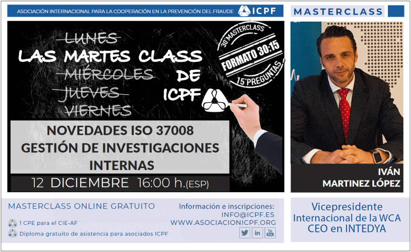 De la mano de Iván Martínez, Vicepresidente Internacional de la WCA, CEO en Intedya, abordaremos como gestionar las Investigaciones Internas en los casos de Fraude, y que novedades propone ISO37008 en este sentido.