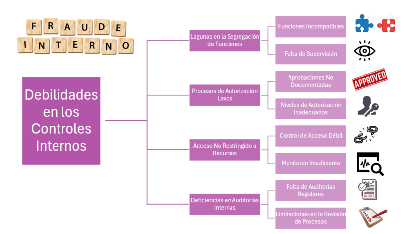 Las organizaciones están constantemente expuestas a amenazas internas, y las debilidades en los controles internos pueden proporcionar oportunidades para que el fraude prospere. Desde lagunas en la segregación de funciones hasta procesos de autorización laxos, cualquier deficiencia en los controles internos puede ser explotada por individuos malintencionados. Este apartado se centra en analizar las áreas donde estas debilidades son más propensas a surgir y destaca la importancia de fortalecer los controles internos como una medida esencial de prevención del fraude interno.