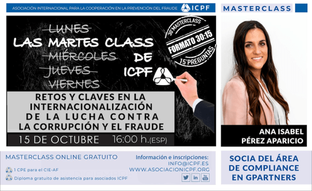 El Blog de FRAUDE INTERNO invita a todos sus seguidores y suscriptores a participar en la Martesclass de ICPF, el próximo 15 de octubre a las 16:00 h (hora de España). (30´+ 15′ de preguntas)