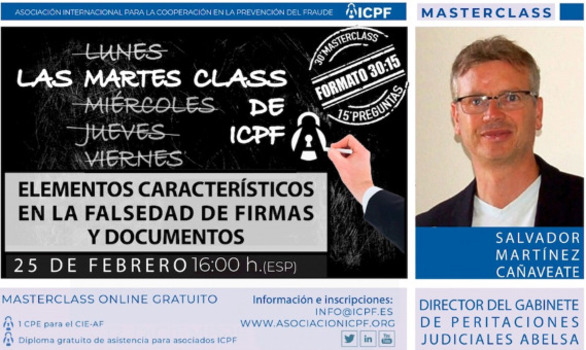 Las MARTES CLASS de ICPF tienen un formato de 30+15, es decir 30´ + 15’ de preguntas de los asistentes, y acreditan 1 CPE para el CIE-AF (Certificación Internacional de Experto Antifraude)