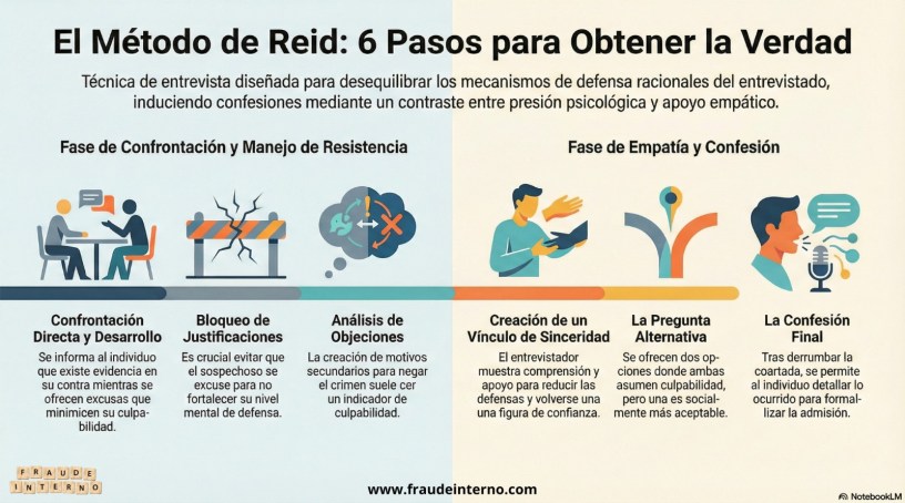El Método Reid es una de las técnicas de entrevista más conocidas y utilizadas históricamente en investigaciones de fraude y otros delitos. Su enfoque se basa en un equilibrio entre confrontación controlada y empatía, con el objetivo de debilitar las defensas racionales del entrevistado y facilitar que la verdad salga a la luz.
