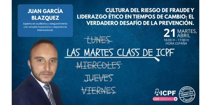 Desde Fraude Interno, blog colaborador en la difusión de las actividades de ICPF, compartimos esta nueva MartesClass que se celebrará el 21 de abril de 2026, de 16:00 a 17:00 (hora española), bajo el título “Cultura del riesgo de fraude y liderazgo ético en tiempos de cambio: el verdadero desafío de la prevención”.